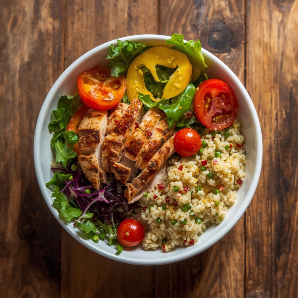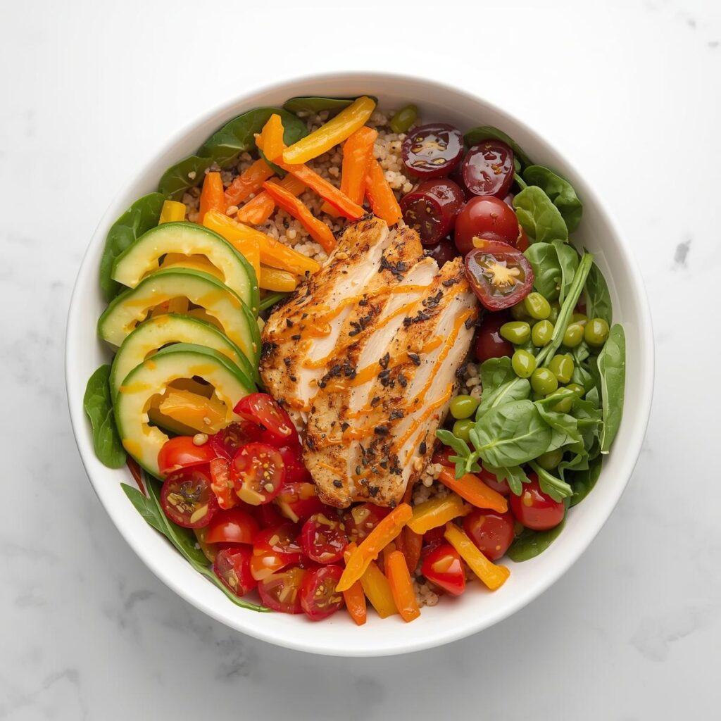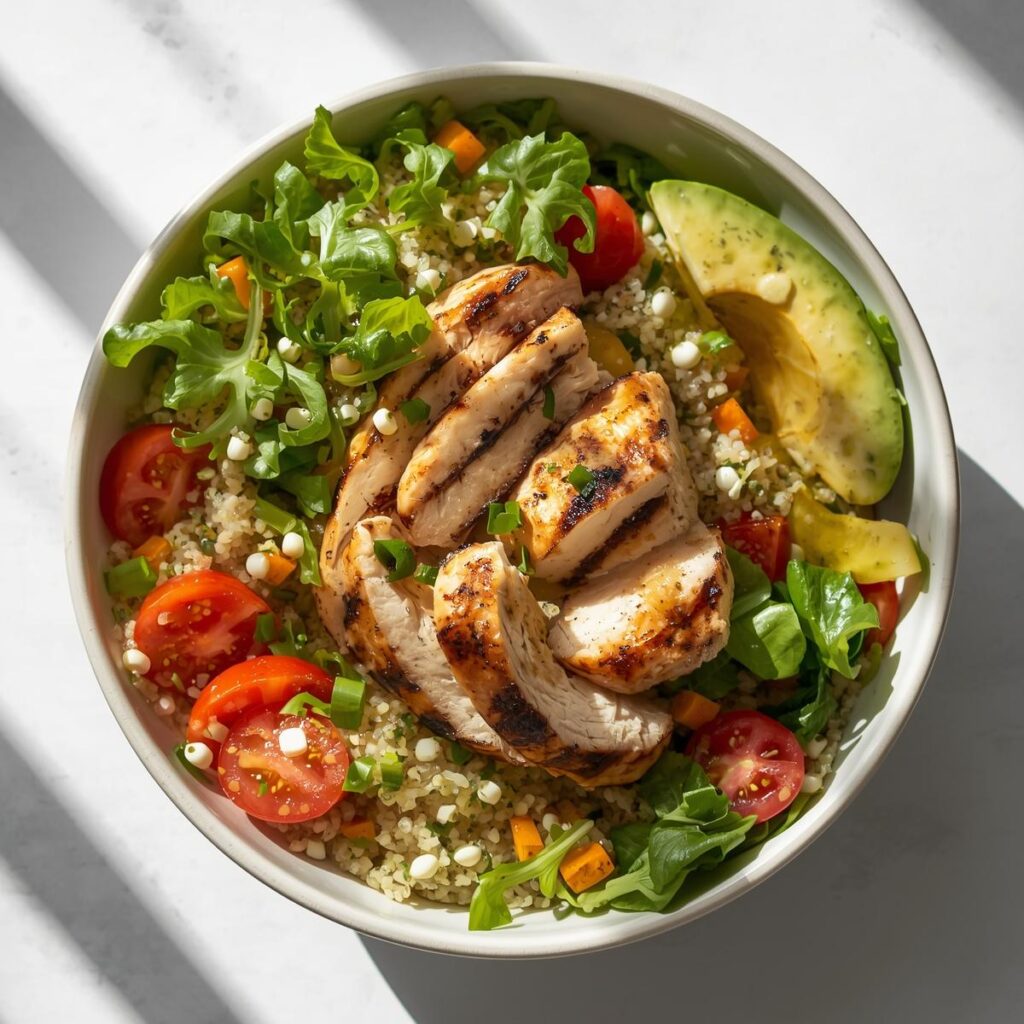 Este bowl é facilmente adaptável: substitua o frango por tofu ou salmão grelhado, e adicione legumes da estação para variar os sabores e nutrientes. Ideal para manter energia durante treinos ou rotina diária. 🥗💪
